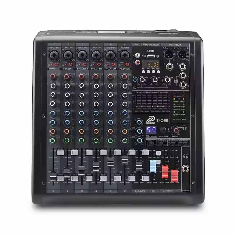 Mixer TFC-08 được trang bị 8 kênh đầu vào micro/line, cho phép kết nối nhiều nguồn âm thanh như micro, nhạc cụ, đầu phát nhạc hoặc máy tính. Hệ thống cổng kết nối gồm XLR và jack 6.5mm giúp thiết bị tương thích với nhiều thiết bị âm thanh khác nhau.